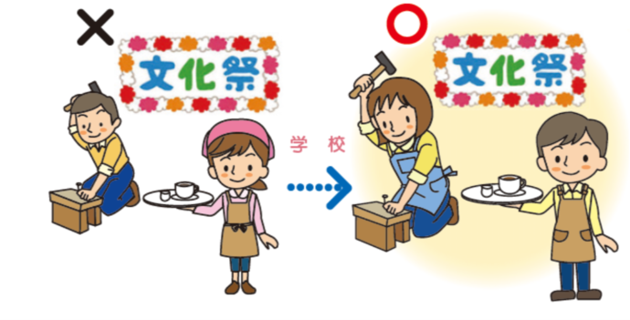 社会には性別に関係なく、さまざまな生き方をしている人がいます。「女性は家事・育児、男性は仕事」というような、固定的な役割分担意識にとらわれず、男女がお互い協力して、分担しているように表現しましょう。