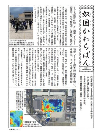 令和3年度に地中レーダー探査を行った春日北小学校で、子どもたちと一緒に発掘調査を実施します。 -